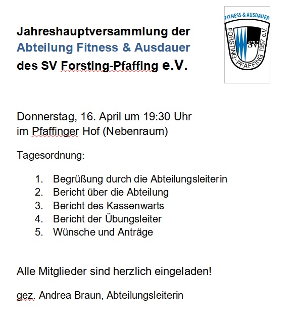 Einladung zur Jahreshauptversammlung Fitness&Ausdauer